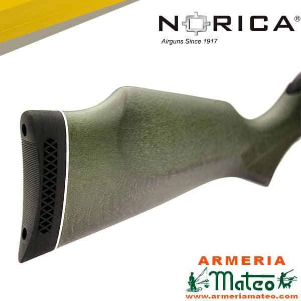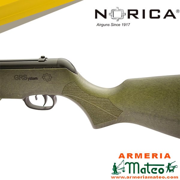 Carabina Norica Hawk con sistema GRS, culata de madera de haya vaporizada y tintada en verde, disparador regulable. Disponible en 4.5 y 5.5.