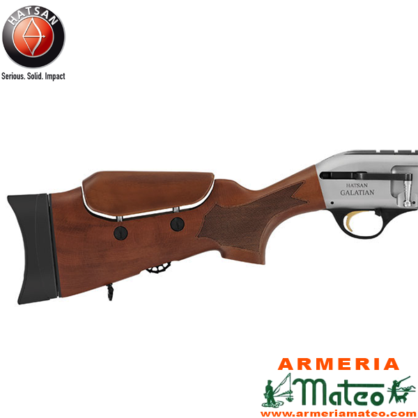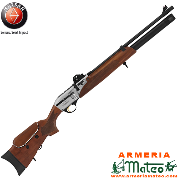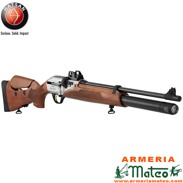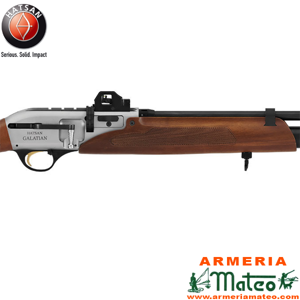 Carabina Hatsan Galatian II de diseño tradicional con elegantes maderas de nogal, receptor acabado en nikel blanco y refinados grabados.