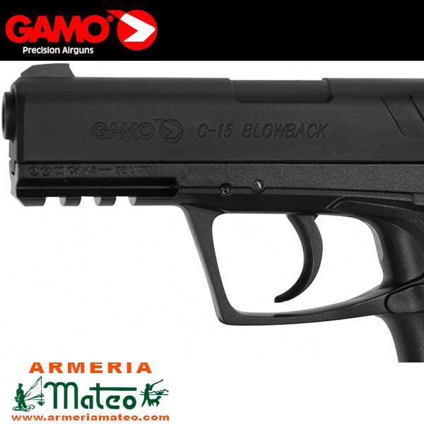 La C-15 es una nueva pistola de aire comprimido GAMO, que dispara tanto bolas BB´s como balines convencionales y de aleación. Con el fin de mejorar la apariencia auténtica a una ya probada y reconocida, esta pistola de CO2 semi-automatica, está dotada de una verdadera acción Blowback, una técnica que utiliza una pequeña porción de aire para mover la corredera hacia atrás cuando se dispara.