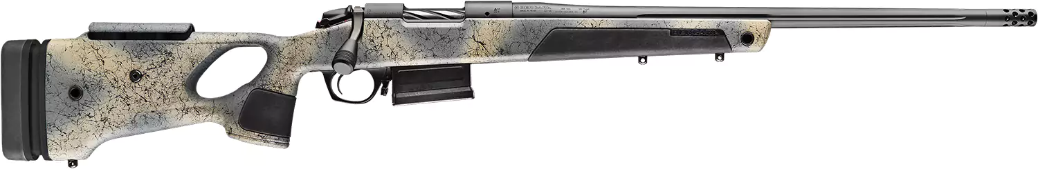 Acción B-14 Ultrasuave acabada en Sniper Grey Cerakote® para una protección avanzada en condiciones climáticas adversas. Un sistema de dos tetones con un extractor deslizante y tope de cerrojo y recámara cónicos para garantizar una introducción y extracción sutil del cartucho.