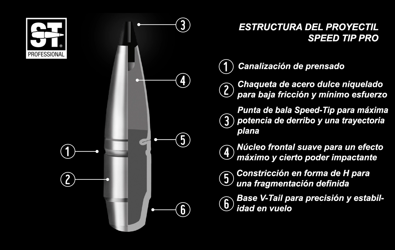 El proyectil Speed Tip Pro ofrece máxima eficacia a cualquier distancia. Indicado para modalidades de caza en las que la capacidad de penetración y el poder de parada son imprescindibles.